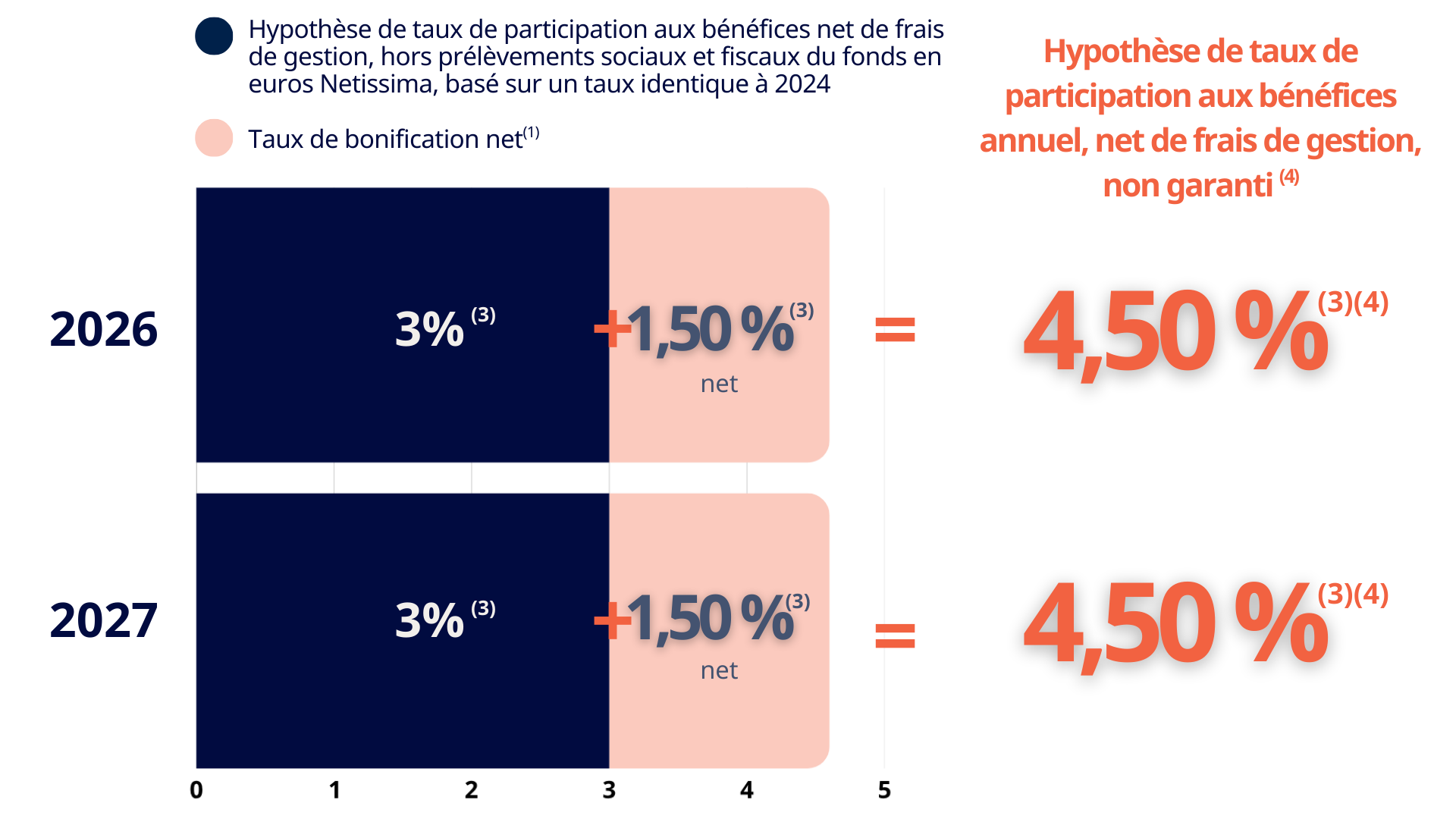 (4) Objectif taux de participation aux bénéfices annuel non garanti établi sur l’hypothèse d’un taux de participation aux bénéficies identique à celui de 2024 pour les années 2026 et 2027, sur le fonds en euros Netissima. Cet exemple est présenté à titre purement indicatif, ne constitue ni un engagement, ni une garantie, et n’a aucune valeur contractuelle.